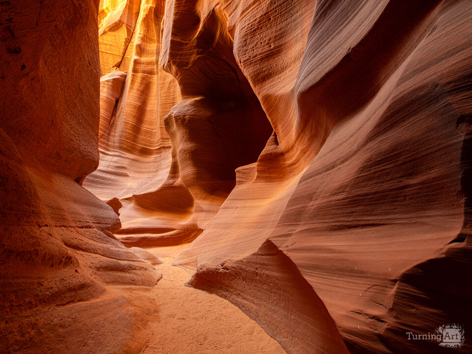 This luminous color photograph of Antelope Canyon's interior glows with an extraordinary depth of warm amber, burnt orange, and sienna — the product of sunlight bouncing between the narrow sandstone walls over millennia of patient erosion. Unlike other canyon images that feature falling sand, this view focuses purely on the sinuous, wave-carved rock surfaces and the glowing light that seems to emanate from within the stone itself. The layered striations of the canyon walls create a rhythmic, almost musical visual texture, drawing the eye deep into the frame toward a radiant golden passage. This is one of the most warmly colored and inviting of the canyon series, ideal for bringing earthen warmth and natural wonder to any space.