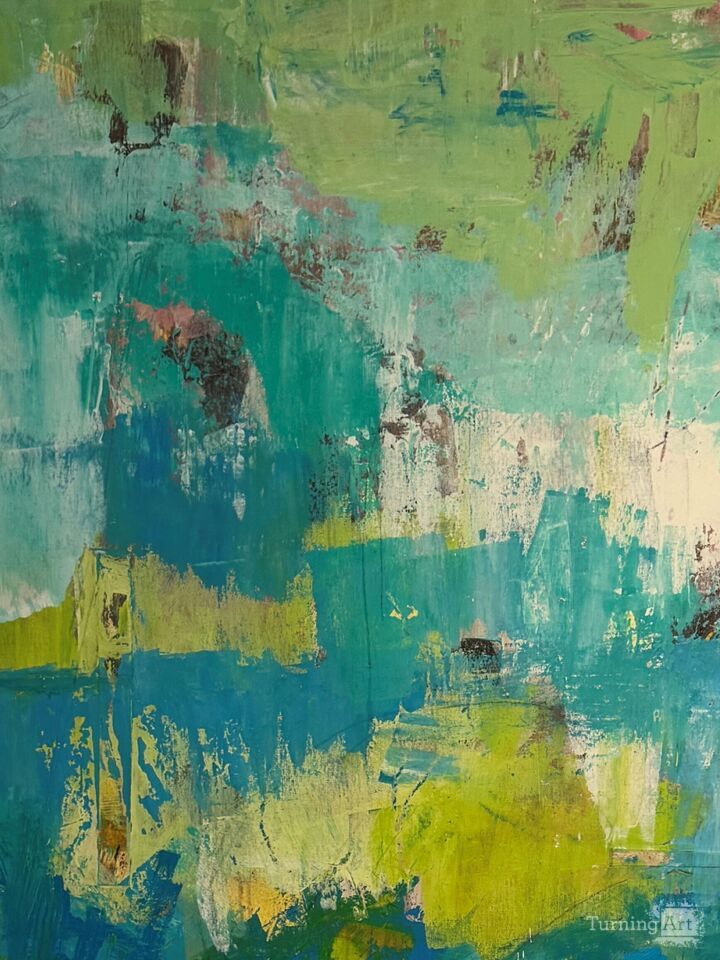 This piece started in Boston and wrapped up in California. It’s base is earth tones with several values of pink and then topped with blue, green, white and yellow values. I absolutely love the texture in this piece.. thick, juicy, drippy in some areas and soft and smooth in others. The other highlight in this piece is the scraping away of the top layer to reveal the earth tones beneath the upper layer pops of color. This piece is magical!