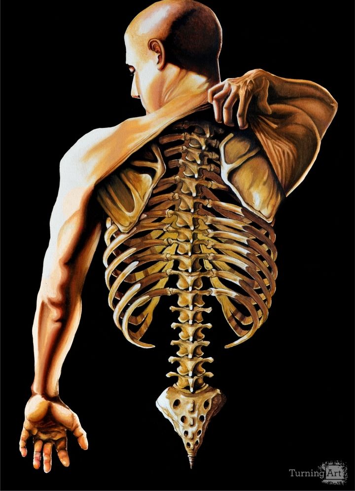 Back in 1995 I while attending college as an illustration major I came up with this concept in a sketch and really wanted to capture it at a larger than life scale. I was inspired by music, movies, culture as well as some photography. My initial intentions were to depict a very macabre and dark image featuring torture / dungeon themed elements. As I was working on the painting it sort of shifted into a cleaner more anatomical look. I'm leaving the painting's meaning open for interpretation. After successfully completing the first (Wrath1), I decided to turn it into a series. I first do a sketch and form the gesture, I then photograph a skeleton in certain ways and use specific lighting. Next I shoot a human in the same configuration. I use the 2 references to complete the painting.