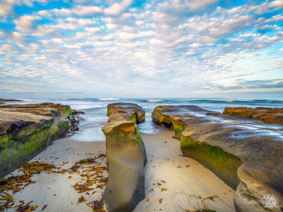 Rock formations lead the eye towards the horizon, where the ocean meets a vibrant blue sky. Wispy clouds add texture to the scene. From Hospital's Reef in La Jolla, California. Thank you for your interest in my work.