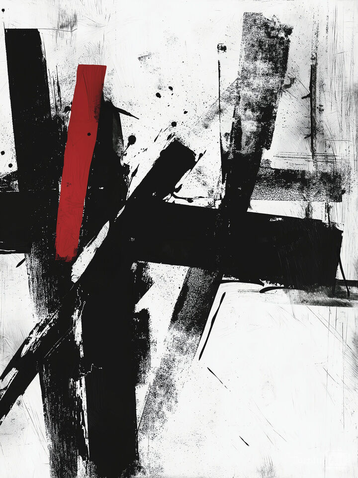 "Thoughts" as marks, trajectories, fragments. In this artwork, black and white collide and overlap, weaving tensions and syntheses. Red surfaces as an impulse, a vivid accent of intense reflection, a fragment of an inner dialogue. A flow of ideas breaks and reforms, oscillating between chaos and control, instinct and order.