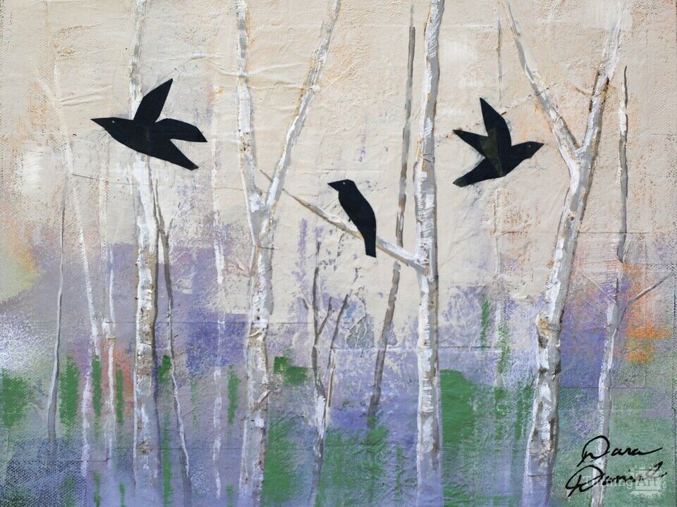 An acrylic collage if Three Crows with whitish trees in the background. For me this painting reflects the silence and beauty of winter.
