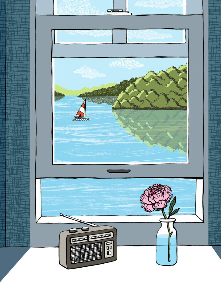 You can almost feel the warm breeze and sunshine and hear the lines of the sailboats clinking on their masts in this calming scene through a summer window. A radio plays gently, while a fragrant peony perfumes the air.