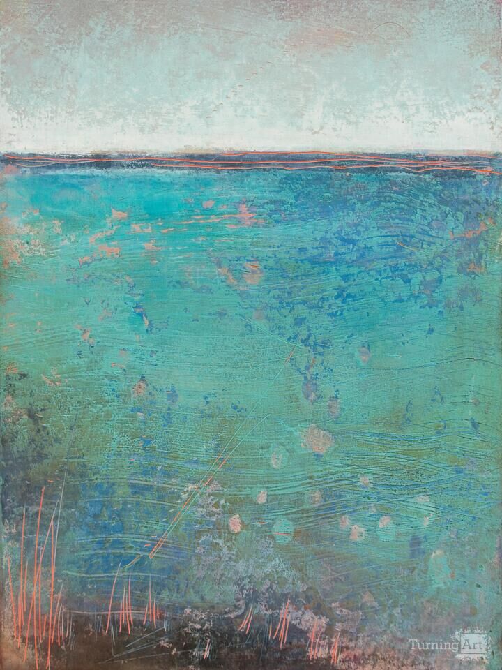 "Tide’s End" is a serene abstract seascape that layers deep blue and turquoise with soft pastel skies and subtle touches of warmth. Textured brushwork and delicate details suggest reflections and quiet movement, creating a sense of calm. Perfect for creating a peaceful atmosphere, it brings a sense of balance and natural beauty to any space.