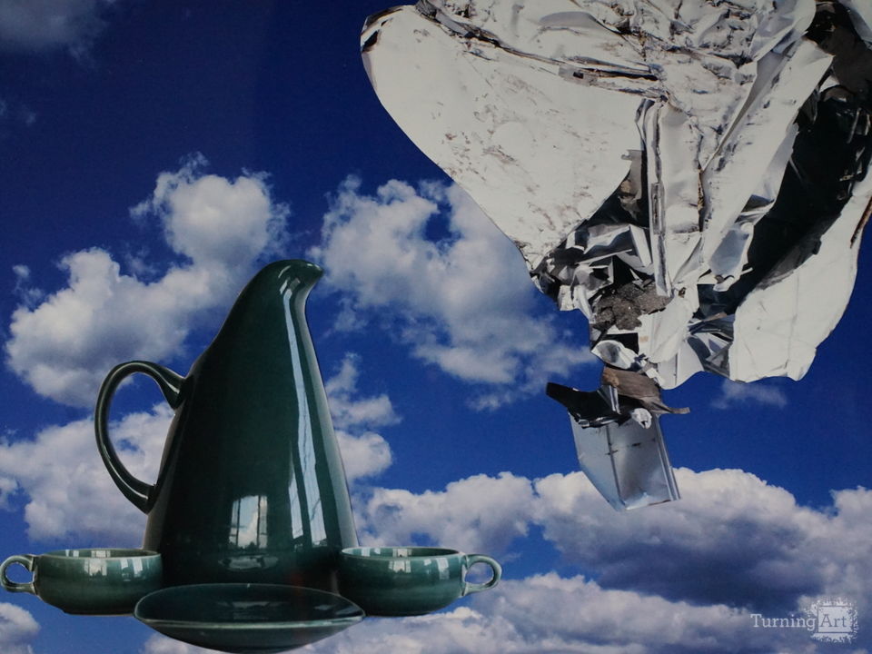 Blue pitcher and tea cups with crushed metal create this fantastic skycap.
