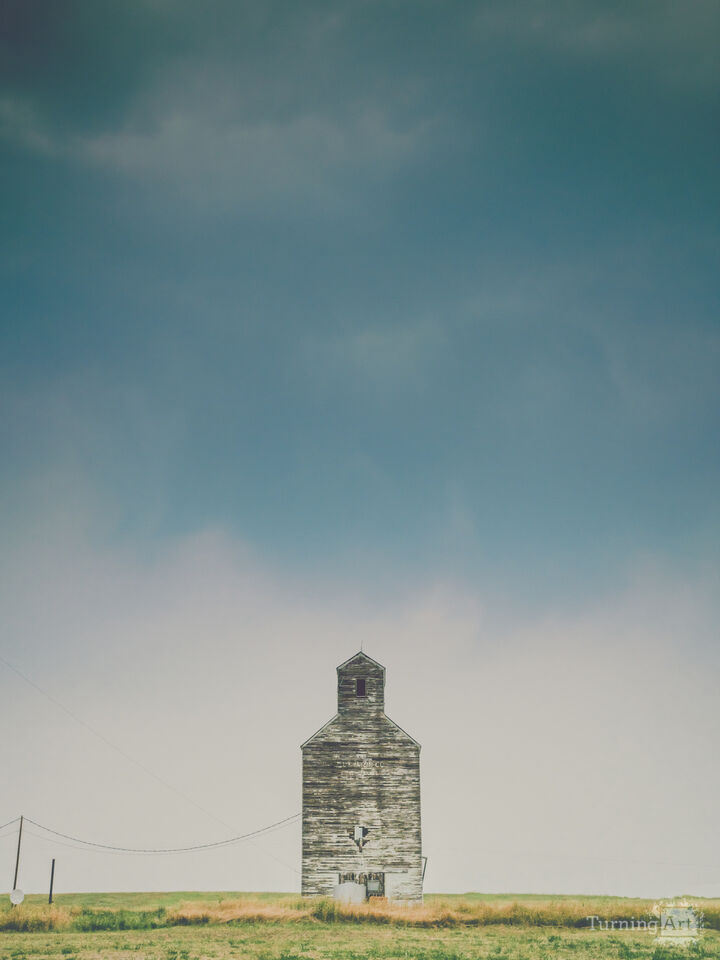 A weathered, wooden grain elevator stands as a solitary sentinel in the center of the frame, its faded and peeling white paint revealing the silvered timber of decades spent enduring the elements. The structure is positioned against an immense, moody sky where a heavy canopy of slate-gray storm clouds looms overhead, transitioning into a hazy, pale mist near the horizon. Below, the building is grounded by a flat expanse of green prairie and golden, dried grasses, with a thin power line stretching away into the distance, emphasizing the isolation and quiet resilience of this rural icon under the weight of an approaching storm. I love to capture these old icons of the American West, standing tall amongst the open skies and broad fields that surround them.