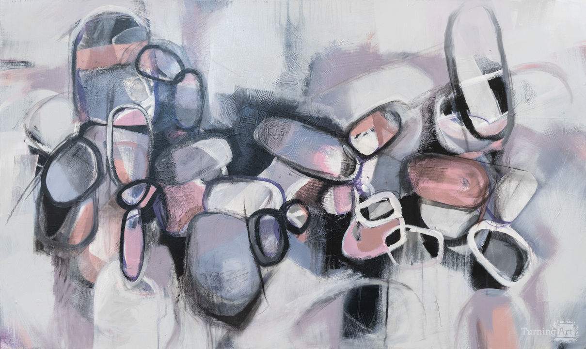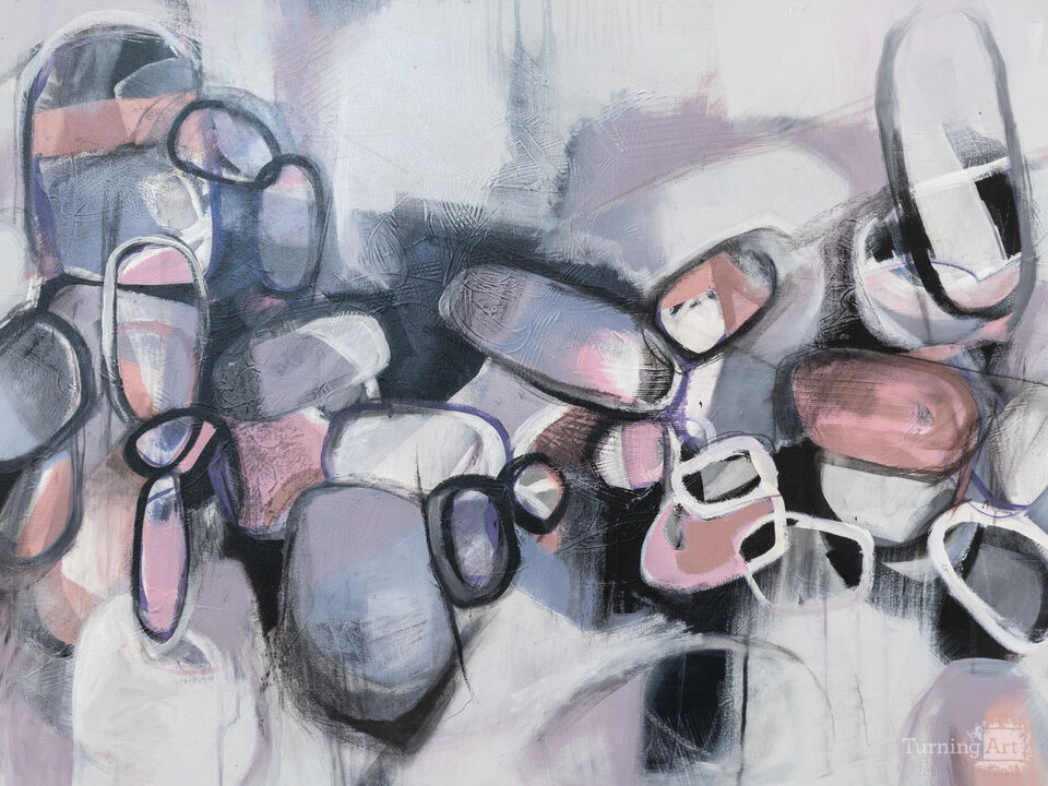 Pink, black, gray and white are the predominant colors. The layers The orb-like shapes are reminiscent of Good N Plenty candy.