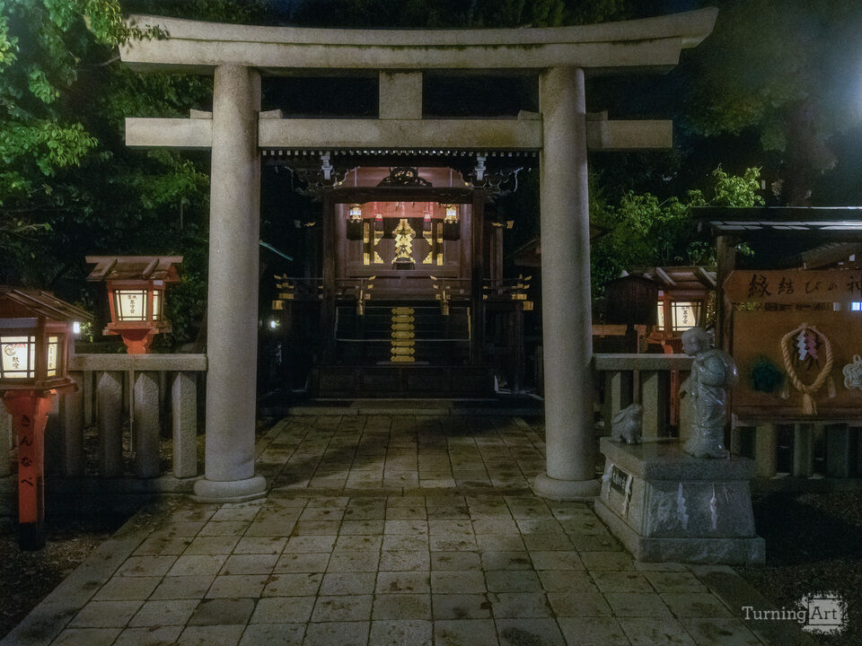 A softly lit torii gate frames a small shrine at night, creating a peaceful and contemplative atmosphere.