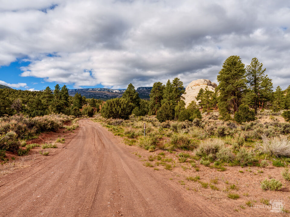 A photograph looking down a dirt road as the morning sun highlights a white rock formation on the right amongst the trees in Torrey, Utah, United States. This is along the scenic byway highway 12. Some clouds are moving into the area adding drama to the sky and softening the rugged landscape. This is near Capitol Reef National Park.
