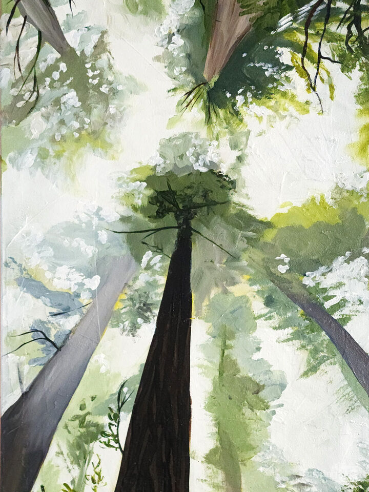 In “Towers in the Mist,” a giant dark tree trunk fills the center of the painting, in high contrast against the bright hazy atmosphere filling the rest of the painting. The tops of the trees are soft green shapes in the fog high above us. You can feel that the morning mist is going to evaporate from the heat of the day’s bright sunshine.