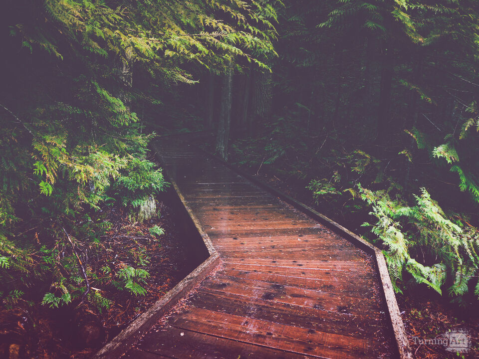 The wooden walkway called "Trail of the Cedars," disappears into the calming lush forests of Glacier National Park, on a rainy Spring day. This wooden walkway allows for a peaceful walk through the old growth forests, ducking under branches of green moss and delicate ferns. On a rainy day, the forest scent is amazing and the air is alive with fresh scents of wood and foliage.