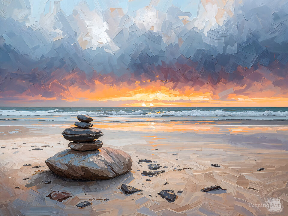 A serene beach setting with a stack of smooth rocks in the foreground. The horizon showcases a stunning sunset with vibrant oranges and calming blues. Created with AI plus other digital editing in an impressionist painting style.