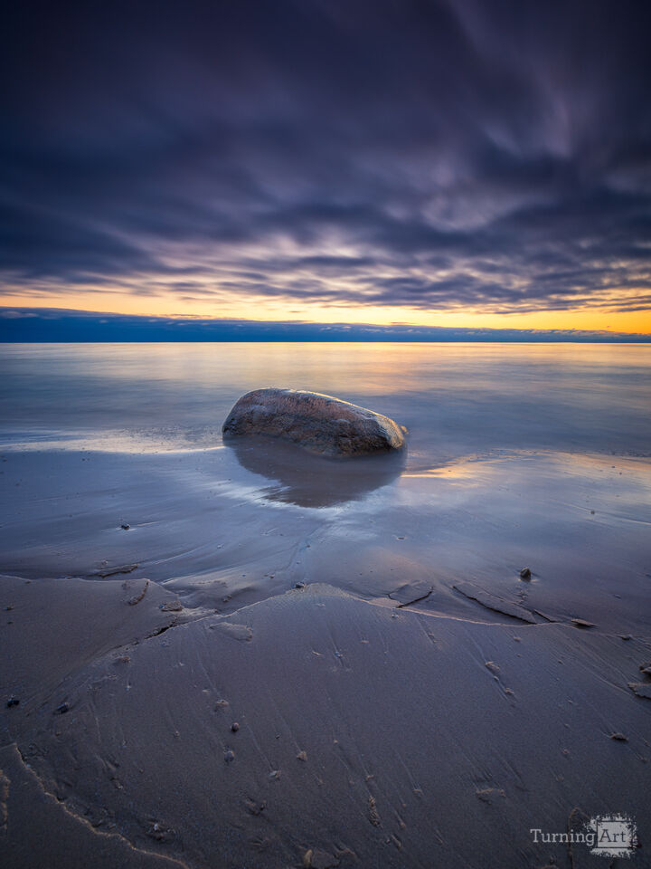 Gentle waves wash over a sandy shore with a large rock in the foreground at Doctors Park in the Village of Fox Point, WI. The sky displays vibrant hues as the sun rises, casting reflections on the water.