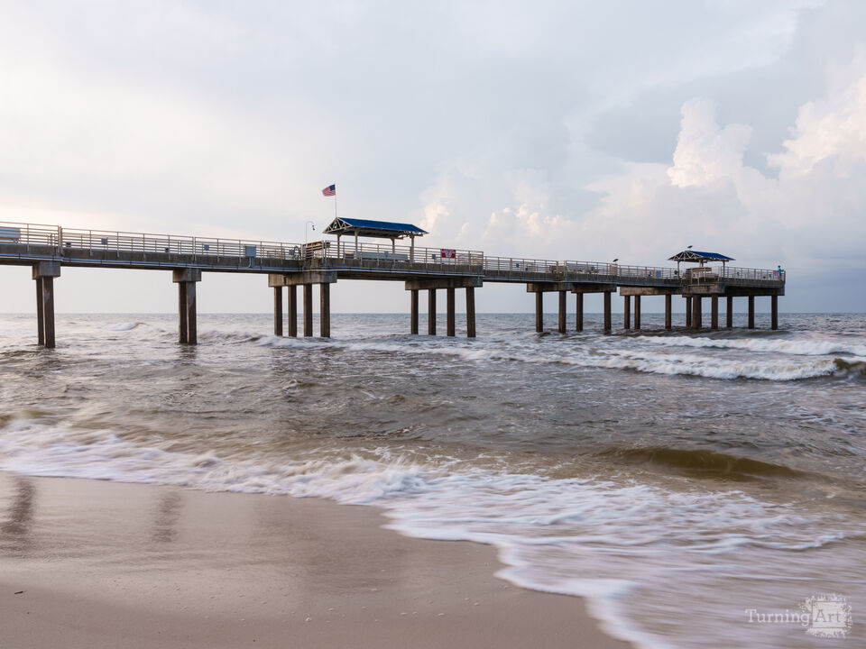 Soft Gulf waves sweep onto the sandy shoreline during a peaceful early morning in Orange Beach, Alabama, USA. Sunrise colors were coming to an end, leaving soft blues in the sky. A private fishing pier reaches out over the calm coastal water, adding depth to the scene. The slower shutter speed creates a sense of motion, on the edge of the surf as it washes ashore. A tranquil moment where the gentle rhythm of the ocean invites you to breathe, unwind, and let the day begin with ease.