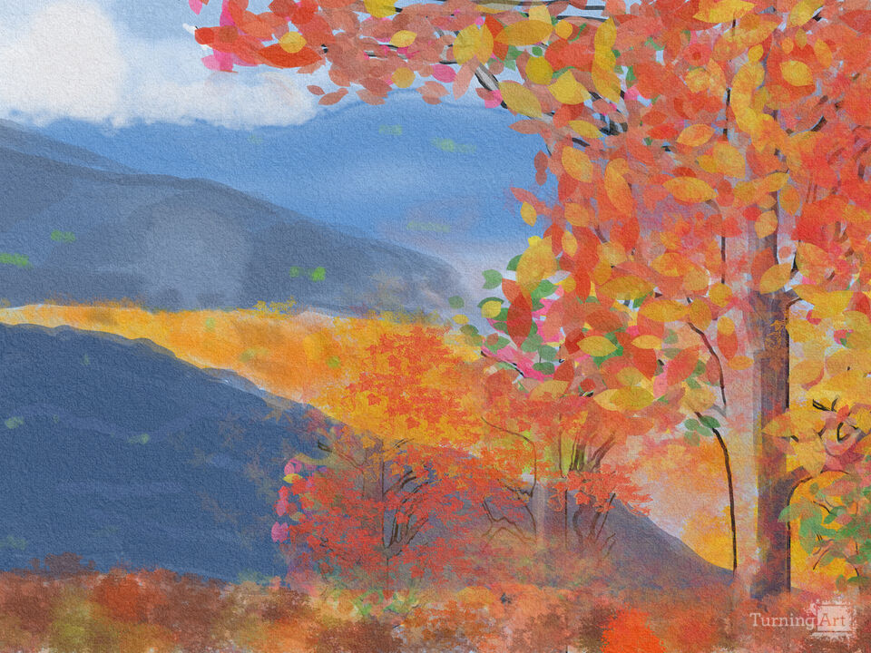The textured, layered brushstrokes give the painting a palpable energy, echoing the movement of leaves rustling in the breeze and the transformative spirit of the season. The transition from the vivid colors of the hillside to the cool, muted blues of the mountain range demonstrates an effective understanding of atmospheric perspective, instilling a peaceful feeling that balances the vivacity of the fall foliage. The delicate, soft blue of the sky acts as a serene complement to the warmth below, preventing the composition from feeling overwhelming and offering a place for the eye to rest.