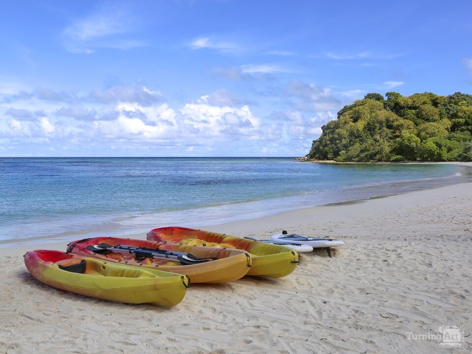 Antigua and Barbuda, located in the Caribbean, are the home to numerous gorgeous beaches. This image was photographed in early morning, highlighting the crystal blue water, sandy beach, and quiet beauty of the island. Kayaks and surfboards on the sand suggest water sports are popular at this scenic beach as well.