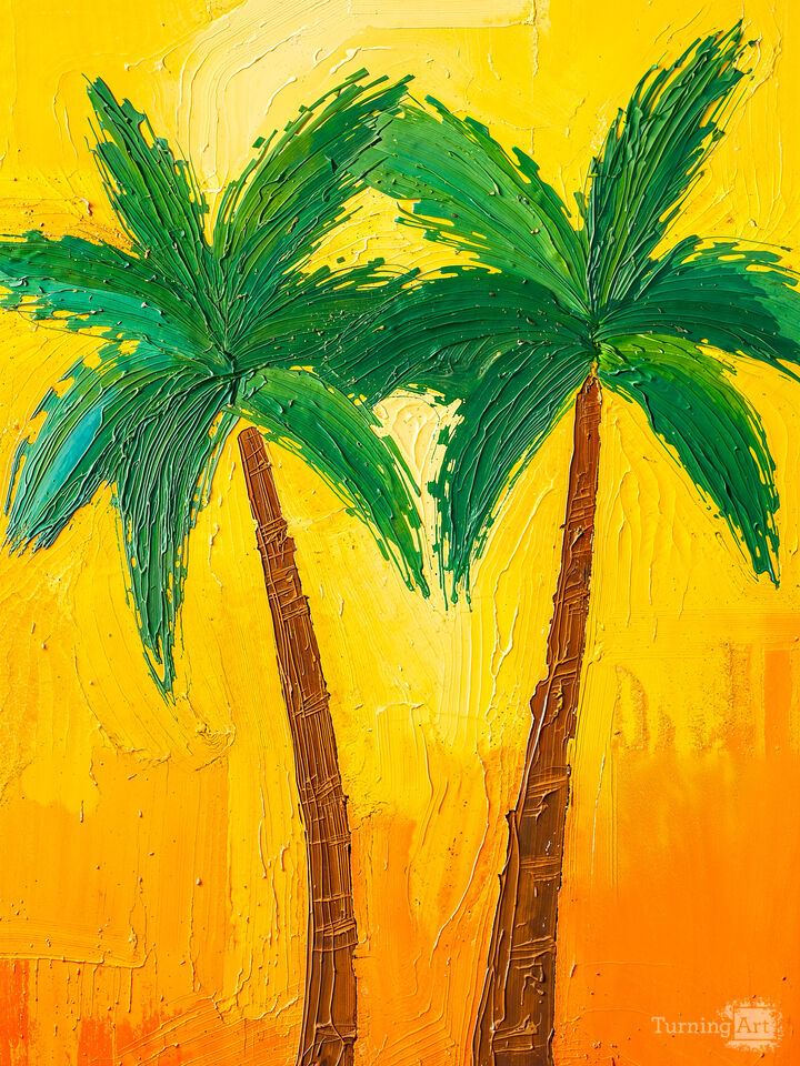 Two tall palm trees are set against a vibrant yellow and orange sky, capturing the essence of a tropical sunset. The textured brushstrokes add depth and movement to the scene.