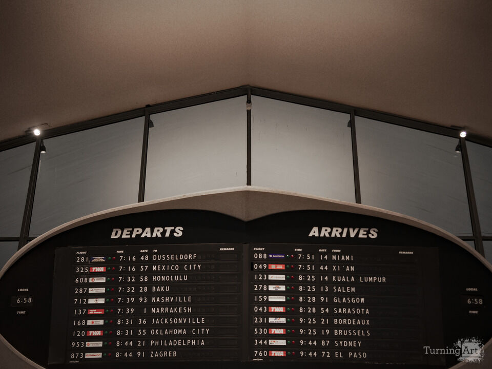 Eero Saarinen’s masterpiece, the TWA Flight Center at JFK airport. This building is a mid century jewel, a beautiful yet functional building that served as a terminal until 2001. I stayed at the hotel for two days during the early stages of the pandemic, waiting for my flight back to Los Angeles. It was deserted, because of the pandemic. It was a unique opportunity to see this architectural wonder undisturbed by masses of people and noise. The dynamic, endlessly curving shapes, the mid-century style, the instant evocation of an era when travel was a luxury – it was all there. The evening and night brought soft light, interior curves were strong, small recesses were dark, the TWA signs in their bright red contrasted to the grey concrete. I knew sunrise would provide stunning light and shadow, so I was up before dawn and shot for 3 hours, admiring the structural complexity, the long shadows from the Eero Saarinen designed chairs and tables, the hand rails down the main stairs.