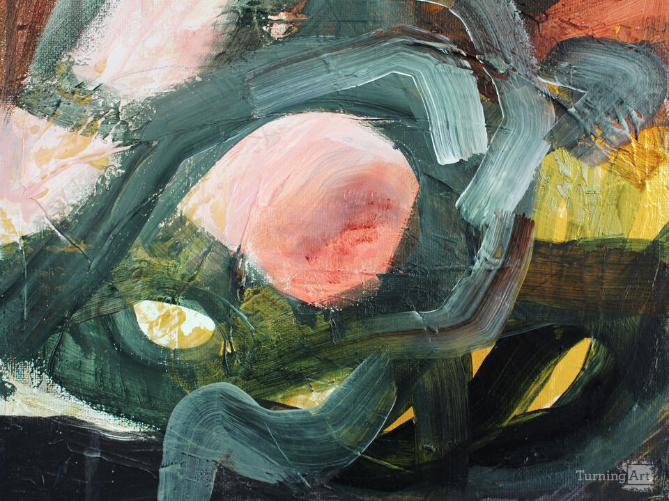 “Twilight Mystery” grows from peaceful moments in my own garden, where moody spruce-green tones meet soft pink floral hints. Its abstract shapes capture the hush of dusk and the quiet magic before night. A touch of holiday warmth runs through it, with festive gold and light pink glowing through the spruce color.