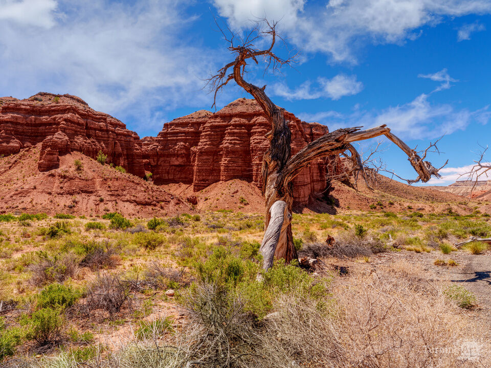 A cool twisted dead tree stands in front of some bold orange/red rock mountains at Capitol Reef National Park in Torrey, Utah, USA. Vegetation spots the desert terrain adding some green contrast to the landscape and blue partly cloudy sky.