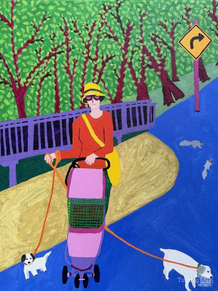 A heartwarming painting inspired by my long walks in Eagle Lake Park. The scene portrays two dogs 'walking' their human amidst the park's serene landscape. I captured the joyful energy of the day, with squirrels playfully scampering across the path. The artwork evokes a sense of connection with nature and the simple pleasures of observing the interactions between humans, animals, and their environment.