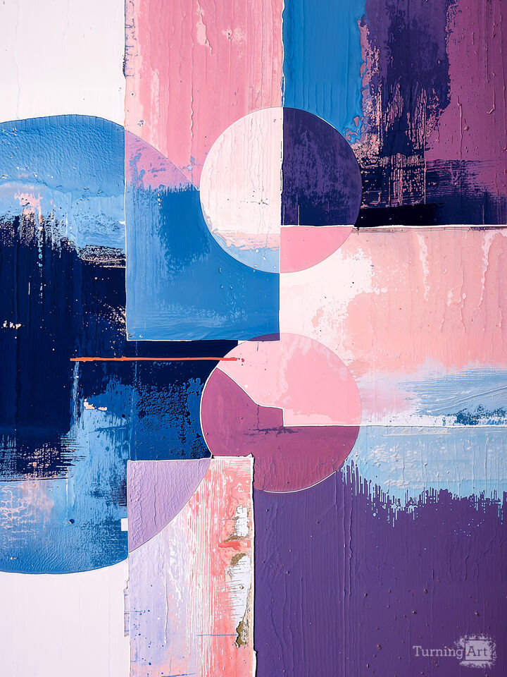 Geometric shapes, including circles and rectangles, are layered in a striking composition. Varying shades of blue, pink, and purple create a vibrant and textured visual effect.