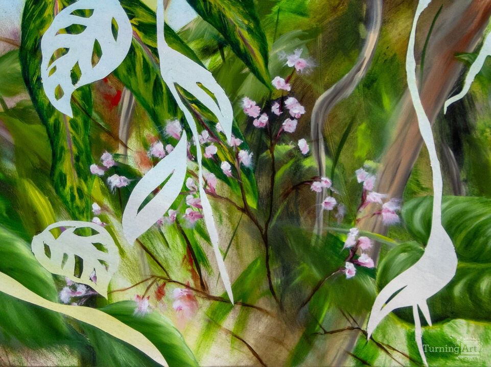 A collage of abstracted tropical plants from around the world. Colors and gestures swirl together to create a unique view into the rainforest understory.