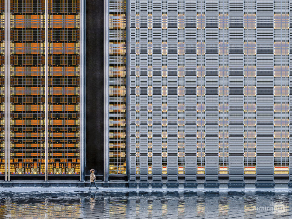 The artwork is part of a series, titled Unreal Reality, in which an original photograph, shot on location in various international cities, is digitally blended with the elements taken from the edges of the frame to create an expanded cityscape surrounding the subject. The outward growth of the frame is accomplished by utilizing the Fibonacci-based sequence of numbers to produce aesthetically pleasing patterns. The project is a subjective approach to photography favoring perception over seeing. It is meant to re-invent the viewer’s relationship with the reality of the outside world around him/her. This deviation from the norm of realism is emphasized by these large-scale artworks, depicting urban landscapes containing spaces with vast perspectives where buildings soar above the human scale and architectural elements unique to each city produce one-of-a-kind geometric patterns.