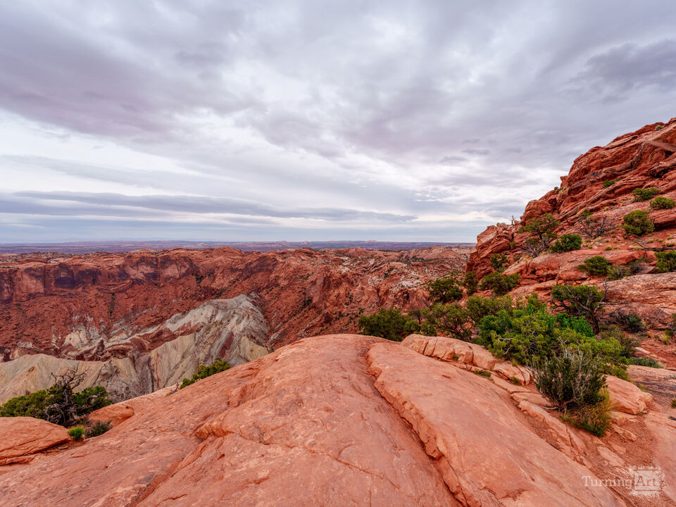 This photograph highlights the dramatic landscape of Upheaval Dome and the surrounding cliffside terrain in Canyonlands National Park, near Moab, Utah, USA. Beneath a sky filled with drifting clouds, soft shades of gray and lavender cast gentle light across the rugged desert scenery. The vast, crater-like formation is encircled by layered canyon walls and richly colored sandstone cliffs, showcasing the park’s striking geological diversity. Upheaval Dome remains a subject of ongoing scientific debate, believed to have formed either from a meteorite impact or the upward movement of a massive salt dome deep below the surface. The subdued, overcast conditions enhance the sense of mystery, making this iconic viewpoint in the Island in the Sky District a memorable destination for hikers, photographers, and those exploring Utah’s red rock landscapes.