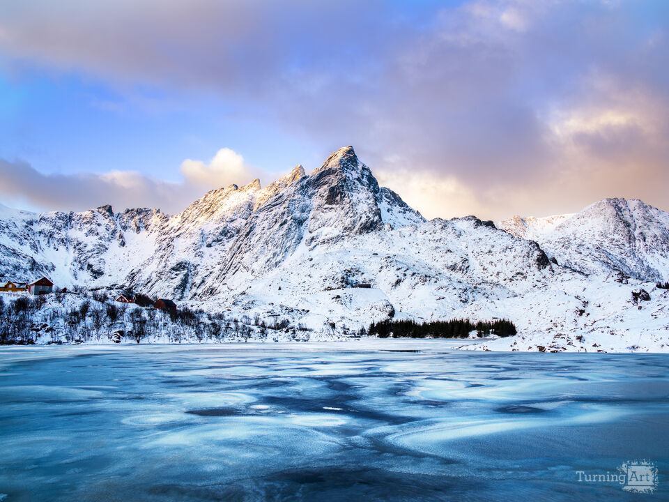 The sun rises on Norway's Skottinden mountain on the Lofoten Archipelago. Winter in Arctic Norway is harsh, beautiful, and random. That last feature created the unique pattern in this lake ice. Although the snow cap on Skottinden makes it look like a typical Norwegian winter, leading up to me making this photo, there were several days of above freezing weather. This partially melted the ice sheet on the lake, which was just in the process of refreezing when I was there. The result is a wispy circular pattern influenced by strong winds.