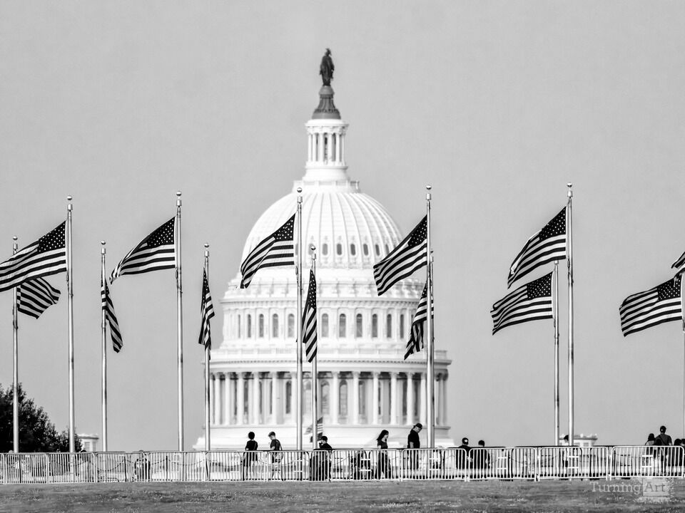 Capitol Dome and American flags, National Mall, Washington, D.C. Black and white photograph showing the U.S. Capitol Building crowned by the Statue of Freedom, with flags in the foreground. 2025.