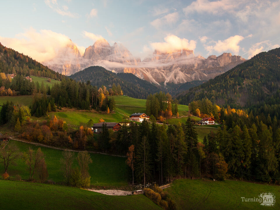Val di Funes looks like it belongs in a fairy tale. Even it's names "Val di Funes" and "Villnoß" sound enchanting. Over this valley the Odle mountain group of the Dolomites rise sharp and bare against the sky. Their peaks catch the last light of day. Below, the green fields roll softly, dotted with small houses and inns.