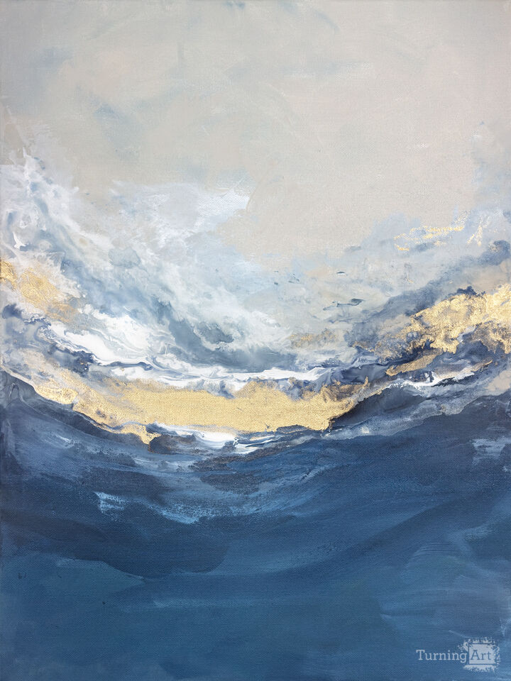 Immerse yourself in the quiet majesty of the coast with Vast Escape No. 2, a sweeping abstract seascape that channels the expansive beauty of sea and sky. The palette drifts from varying shades of blue, grounded by sandy neutrals and illuminated with delicate touches of gold. Fluid and atmospheric, the composition feels both grounded and ethereal—like a moment suspended in time just before the tide turns.