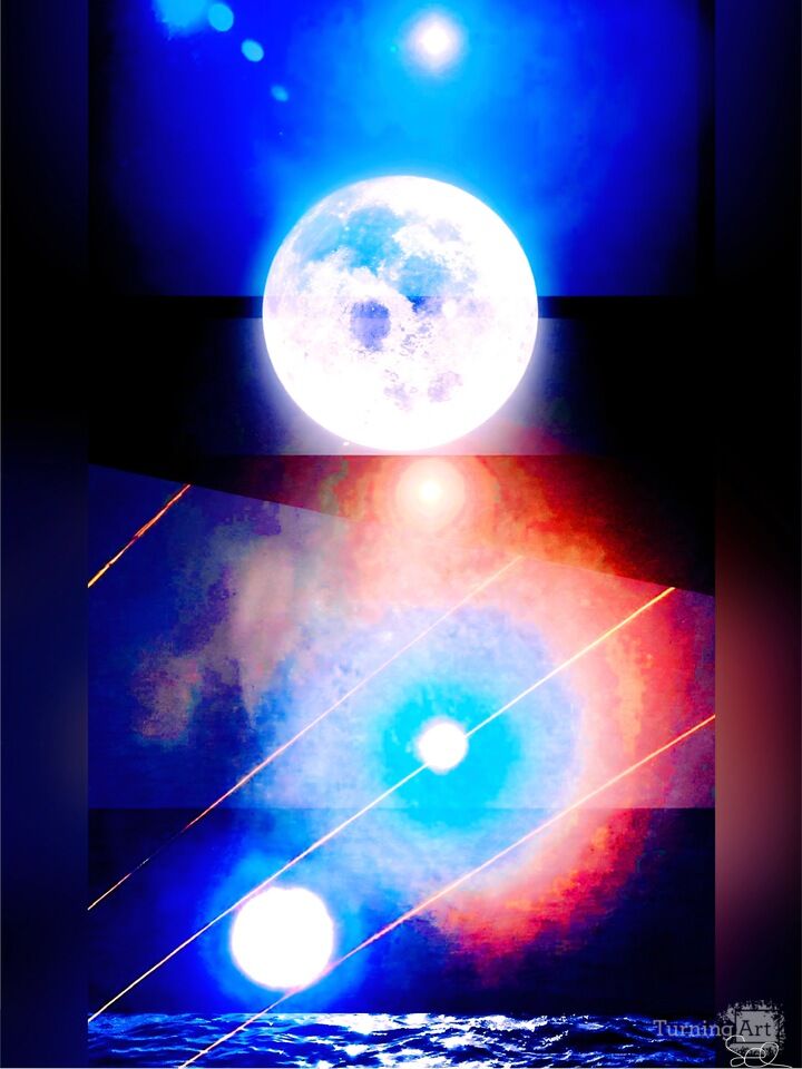 Vedanta: The Teachings of the cycles – Here expressed in this brightly colorful version as the many moons of a cosmic view. This refers to the final teachings of the Hindu Vedas, emphasizing divinity of the soul and liberation.