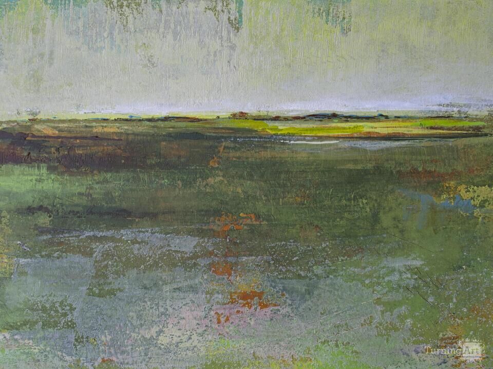 "Verdant Excuse" unfolds as a rich abstract landscape, where earthy greens, muted browns, and warm oranges merge into a tranquil horizon. Subtle textures evoke weathered terrain and soft, diffused light, enhancing its organic depth. This piece radiates a calming presence, making it an ideal addition to any space seeking harmony, relaxation, and clarity.