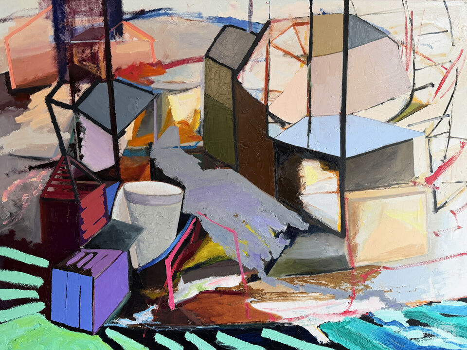 Nicole Maynard is an artist working across media: painting, drawing, digital, and games. She received an MFA in Painting with a minor in Printmaking from the University of Pennsylvania and is originally from Boston, Massachusetts. Her work has been exhibited in solo and group exhibitions throughout the Northeast and Miami. Maynard’s paintings exist at the edge of abstraction and representation, using landscape and imagery such as houses and moving boxes to suggest environments in transition. Her compositions balance structure and spatial illusions, reflecting themes of permanence and impermanence, displacement, and belonging. Architectural ambiguity is conveyed through shifting forms, which play a central role in her process.