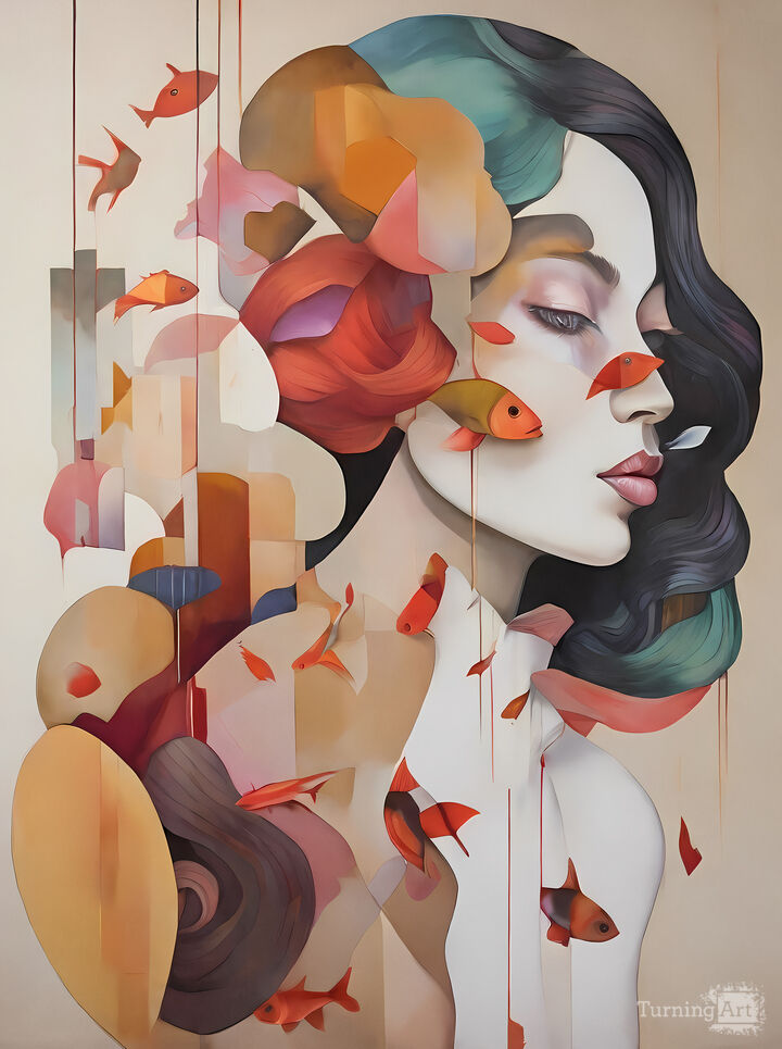 Transform your home into a modern sanctuary with Vibrant Nature Muse 5. This captivating design blends ethereal beauty with a touch of surrealism, featuring a striking face surrounded by vibrant fish and abstract shapes. Perfect for those looking to infuse their space with a sense of wonder and creativity. This art serves as an artistic focal point, sparking conversations and enhancing interior aesthetics. Embrace the blend of nature and imagination to create a unique atmosphere in any room.