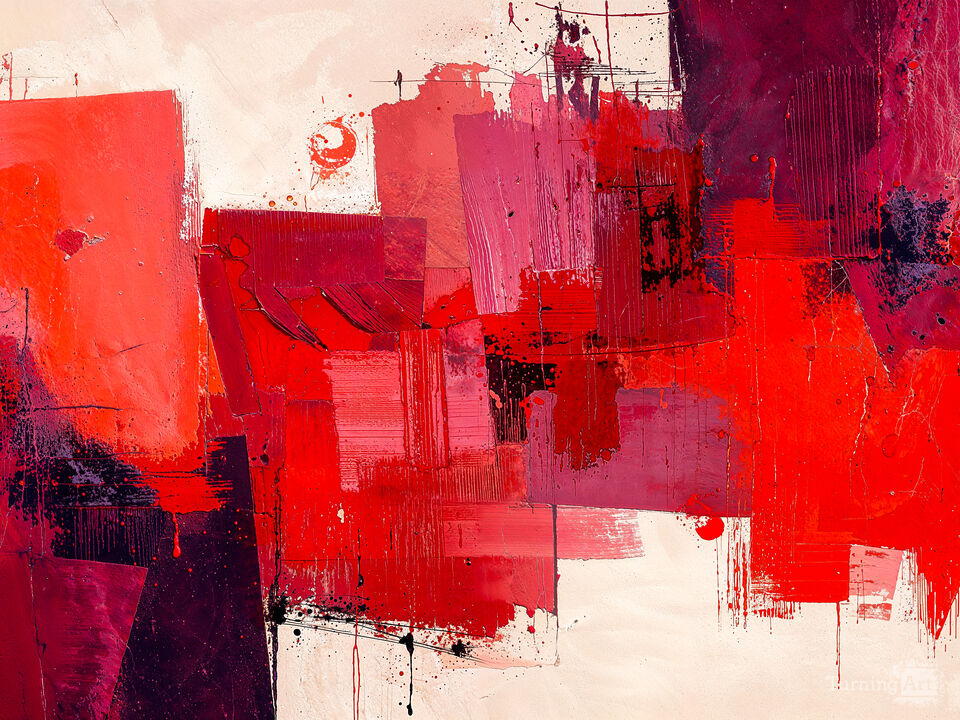 Dynamic red tones and expressive brush strokes create a compelling abstract design. Bold shapes overlap, forming a striking visual interplay.