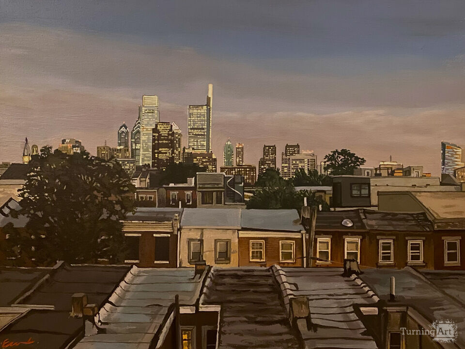 Depiction of the Philly skyline from a rooftop on Girard Ave. in North Philadelphia. Around sunset as the lights start to glow.