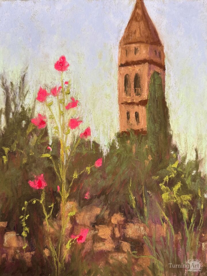 This photo reference is from a bike ride I was doing through small village towns in Croatia. I loved the juxtaposition of the tall flowers against the taller church tower