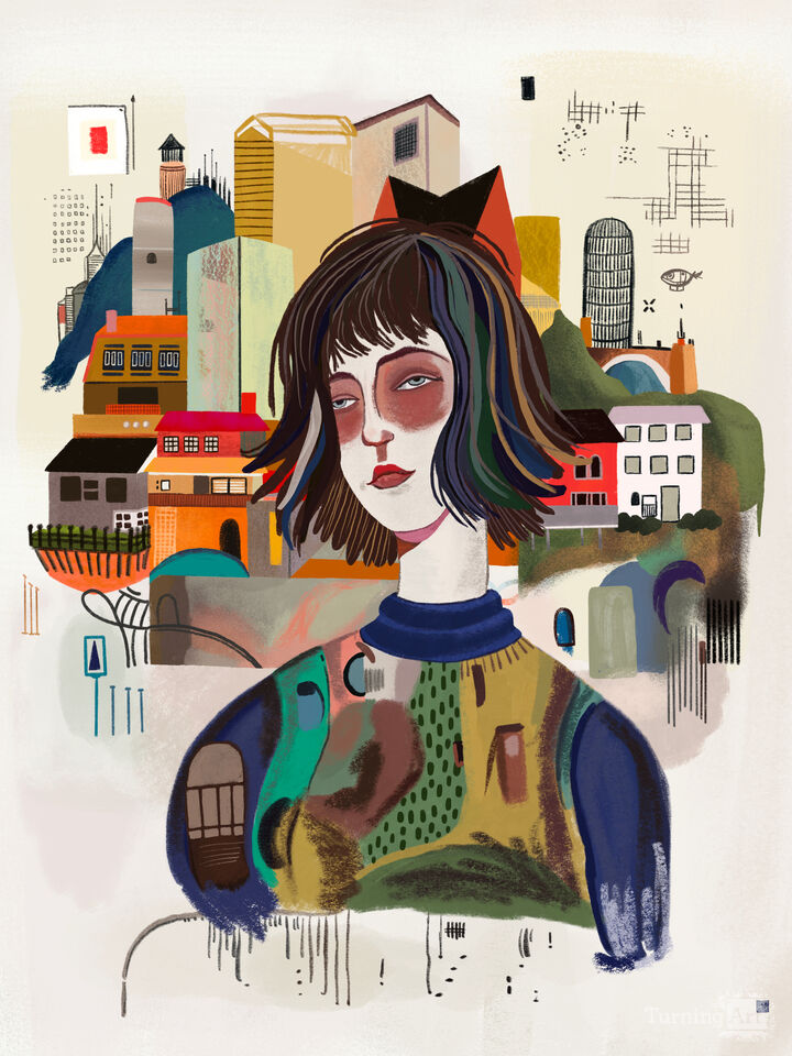 Self portrait with abstract city landscape. Captures the feeling of traveling somewhere new, and vivid memories associated with time and place.