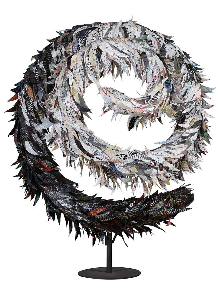 Vortex is a sculptural piece using the ancient and powerful symbol of the spiral. The piece is covered with feathers that gradually move from white to black. The shape and color of this piece refer to the ebb and flow of life and life forms. I make the feathers from plastic recycled bags screen printed with images of endangered birds and overprinted with text in endangered languages such as Yiddish, Shorthand, numerous indigenous languages, and excerpts of Rachel Carson's Silent Spring translated into Spanish.