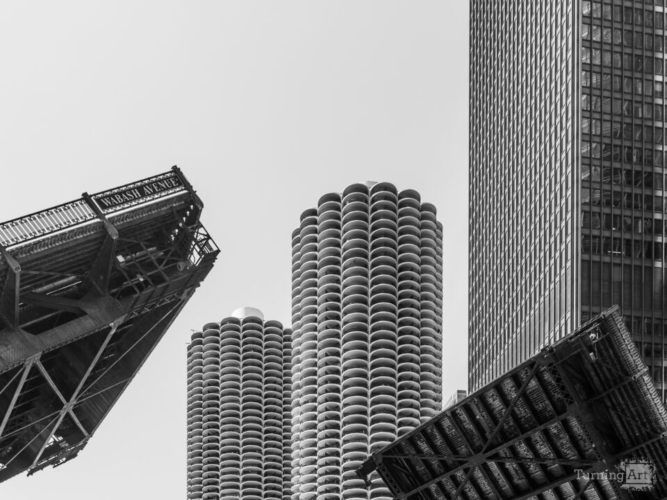 It's always a treat to see the bridges up along the Chicago River. This image is really about the layers of Chicago's story — how different eras of the city's ambition all ended up sharing the same skyline. The Wabash Avenue Bridge is caught mid-lift, its massive arms raised like the city is taking a deep breath, and there's something unexpectedly graceful about that industrial machinery frozen in motion.