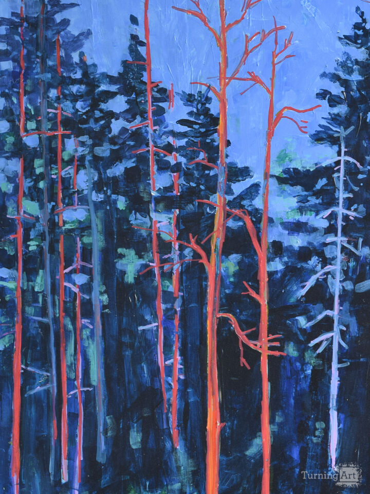 In this painting, I sought to capture the serene yet vibrant essence of a forest under the enchantment of twilight. Using a blend of acrylic and watercolor, I crafted an impressionistic yet semi-abstract scene, where bold, whimsical strokes of red and white highlight the raw beauty of the tree trunks against a deep blue backdrop. It's an embodiment of nature's quiet moment before nightfall, energizing any room with its dynamic, soothing presence.