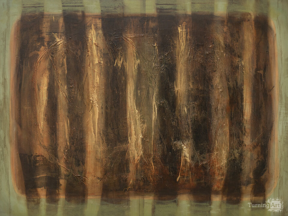 Walk Like an Egyptian playfully explores texture and tone through a rich medley of vertical bands in earthy browns, burnt oranges, and deep blacks. These irregular stripes gather into a lively, textured core that seems to pulse with motion, inviting the eye to follow their subtle overlaps and layered brushstrokes. Set against a soft, muted green background, the composition strikes a balance between grounded natural elements and abstract form, evoking the rough textures of wood or bark without settling into direct representation. The result is a warm, tactile experience that encourages viewers to slow down and appreciate the quiet energy flowing within its carefully constructed frame.