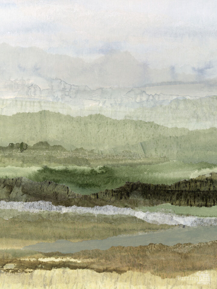 "Wandering Grove" captures the tranquil beauty of misty mountains through delicate layers of acrylic paint, ink, and translucent wax papers. This serene landscape features soft sage greens, dusty blues, and warm earth tones that highlight the quiet beauty of rolling hills and valleys shrouded in atmospheric haze. Inspired by texture and soothing tones, this piece invites a sense of calm contemplation. An alternate landscape orientation of this print is also available.