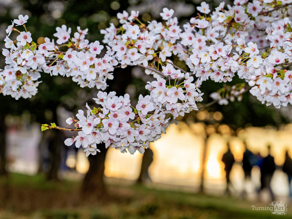 Cherry blossoms at sunrise, Tidal Basin, Washington, D.C. Color photograph showing blossoms in the foreground with blurred figures in the background. 2025.
