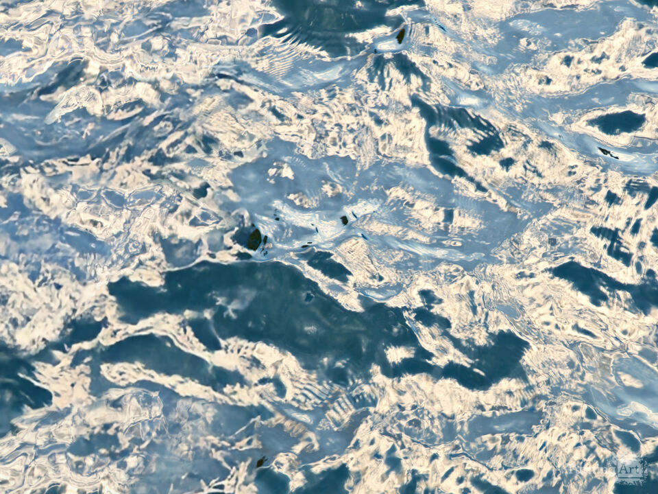 Dynamic water surface, with waves in shades of blue, grey and white. Beautiful waves and ripples on a water's surface make for an amazing play of color, for a relaxing view through this art-piece in your space. Combine this work with its two sister-images to create a 210" W panoramic triptych.