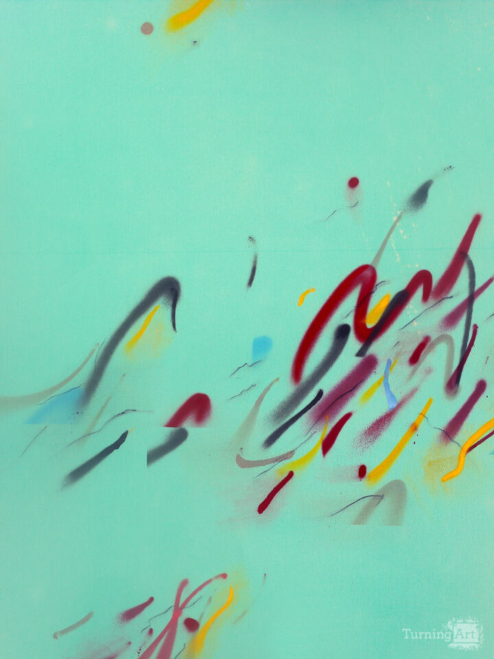 This piece radiates a feeling of lightness and fluid energy. The vibrant marks—some crisp and defined, others misty and dissolving—seem to drift or swirl across the tranquil turquoise surface like reflections on moving water or splashes caught mid-air. There's a rhythm to the composition, almost like ripples after a drop.