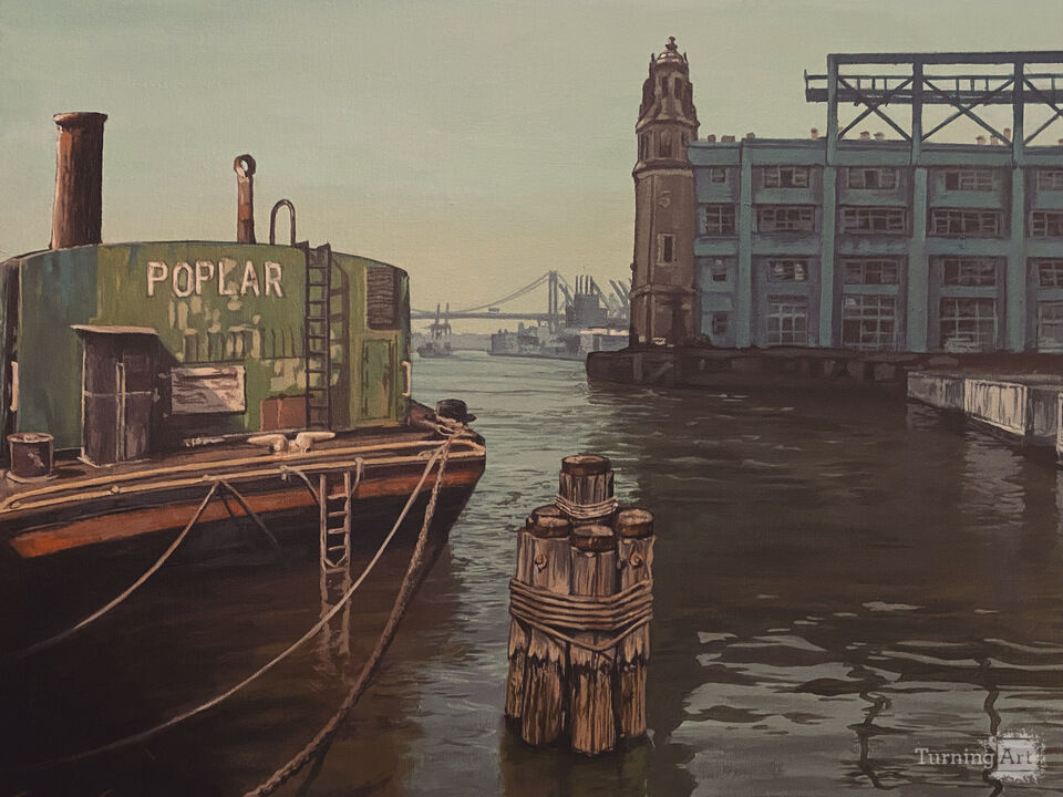 Philadelphia Delaware River waterfront view with Walt Whitman bridge and port of Philadelphia/ Camden in background. Pier 5 and the Poplar barge.